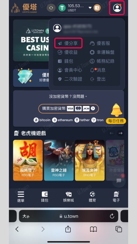 1.登入U.Town網站,點擊右上角頭像>點擊優分享
